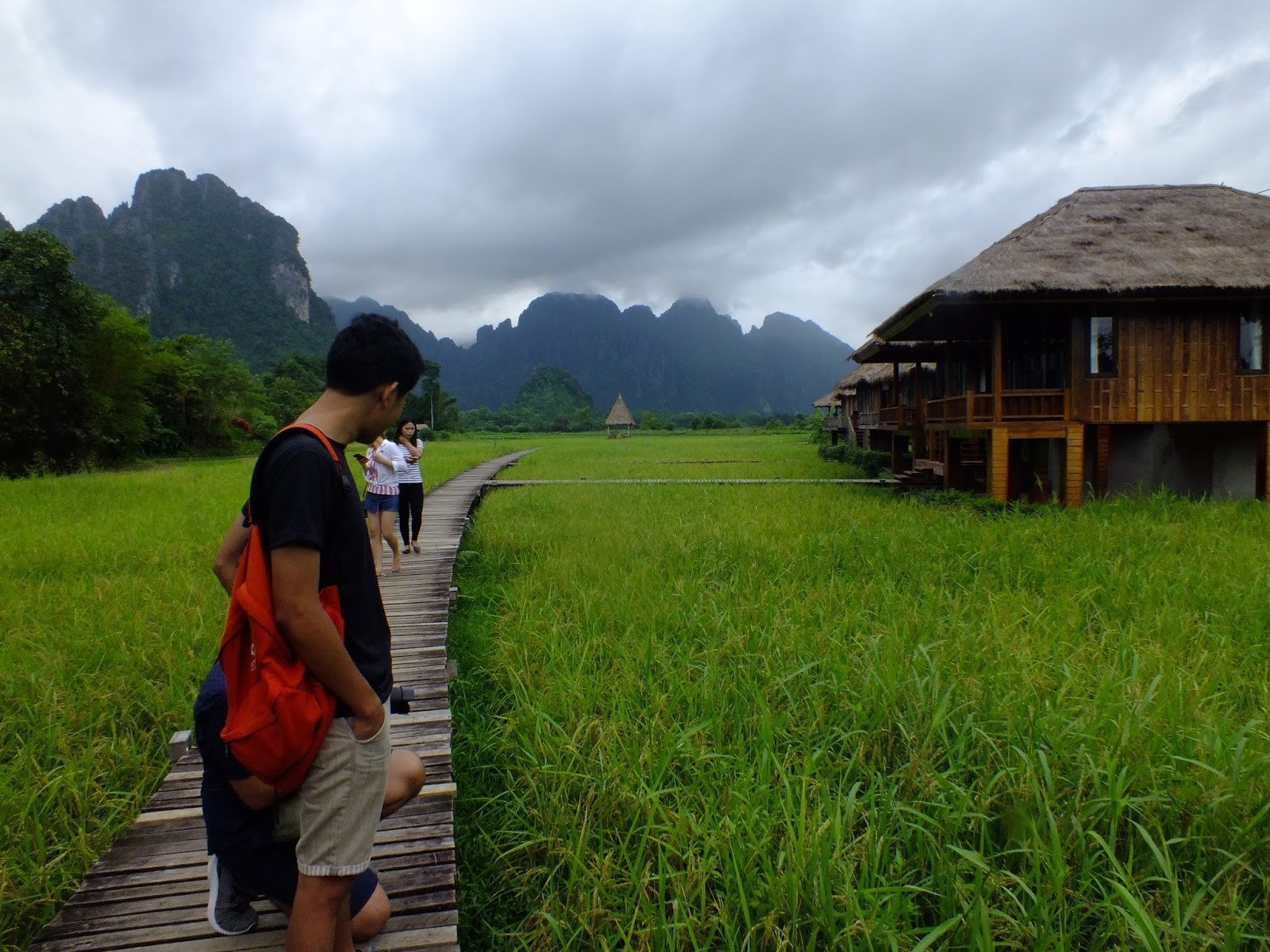 ปกติเค้าไม่ค่อยให้คนนอกเข้ามาถ่ายกัน เนื่องจากจะมารบกวนแขกที่เข้ามาพัก ที่รีสอร์ทนี้ แต่เนื่องจากเจ้าของเป็นคนไทยจร้าาา เลยคุยง่ายๆ เข้าใจกันง่าย ก็ขอเค้าดีๆ เค้าก็ให้ ที่นี่คนไทยก็มาถ่ายรูปเยอะมาก เพราะวิวดี มีทุ่งข้าวเป็นพร็อพ และวิวด้านหลังเป็นภูเขา หลังจากถ่ายรูปเสร็จ ก็เดินกลับมาซื้อของฝาก แต่ผมไม่รุจะไปฝากใครก็เรยไม่ได้ซื้อ 5555 จากนั้นก็กลับไปถามที่ tubing ถามราคา แต่น้องผมมันค่อนข้างกลัว เพราะน้ำไหลเชี่ยววว จริงๆแล้ว การtubingที่ดี และชิลที่สุดคือ น้ำน้อยๆ ค่อยๆไหลไปเอื่อยๆ จิบเบียร์ไป นั่งลอยห่วงยางชมวิวไป และแวะฟังเพลงบาร์น้ำที่มีตลอดทาง แต่นี่เรามาหน้าฝนน้ำสูง ไหลแรง อาจเป็นอันตรายได้ถ้าเล่นคนเดียว หรือไม่มีใครรู้เห็น ซึ่งเรามาที่นี่ กิจกรรมนี้คือไฮไลท์ของงานเลย แต่กลับไม่ได้เล่น